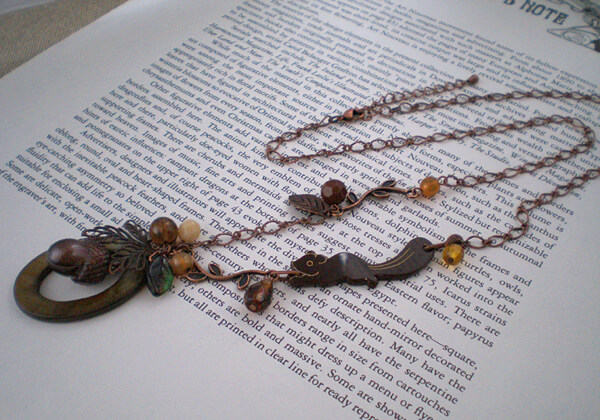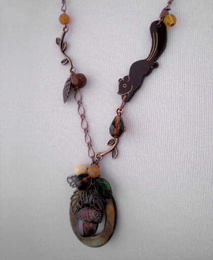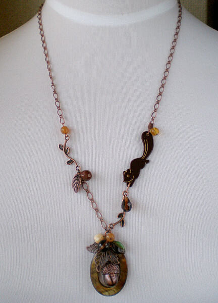 オリジナルのリスパーツを作って、リスが巣穴にドングリや木の実をせっせと詰め込んでいる様子をネックレスにしてみました。