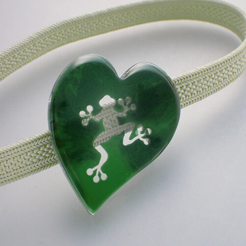 蛙リーフ帯留の色違い1点ものです。フラットな形の葉っぱですが、透明と葉っぱの色との二層構造になっていて、縁を葉っぱの形に合わせて丸める加工をしているので、平面ですが角度によって下の層が見えニュアンスのある仕上がりになっています。オリーブグリーンの2色をマーブルにしています。不透明色ですので帯の色を選びません。通常商品の2色より落ち着いた色合いです。