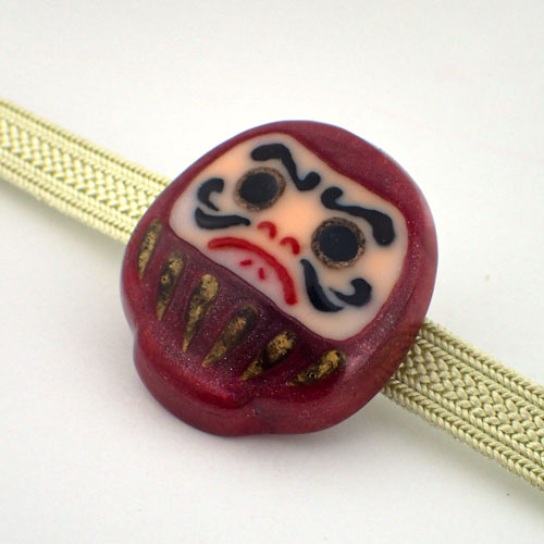 だるまさんの帯留めの色違いです。胴体の模様と白目部分にゴールドパールを入れています。そのため通常商品より色味が落ち着いています。