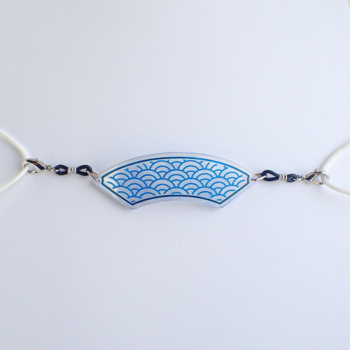 マスクフックの明るいお色です。半透明なオパールブルーのアクリル板にゴールド色の微細なラメが散っていることで青海波の波がキラキラ反射しているようにも見えて、より春夏っぽいイメージです。たての幅が通常商品のマスクフックより3mm程大きくなっています。
