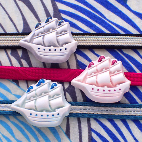 夏は波柄、水玉柄など、涼しさを演出する水の柄が多い季節。そんな季節にゆかたや夏着物に合わせたい帆船柄の帯留めを作ってみました。